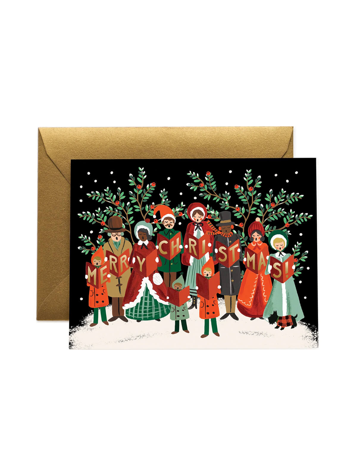 Rifle Paper Co Christmas carolers card featuring a singing choir in traditional winter dress with 'Merry Christmas' in gold foil text.
