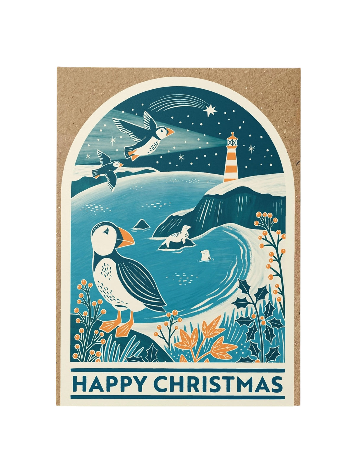 Lino-cut style artwork with snowy coastal scene featuring a lighthouse, seagulls and Happy Christmas text. Die-cut arched design.
