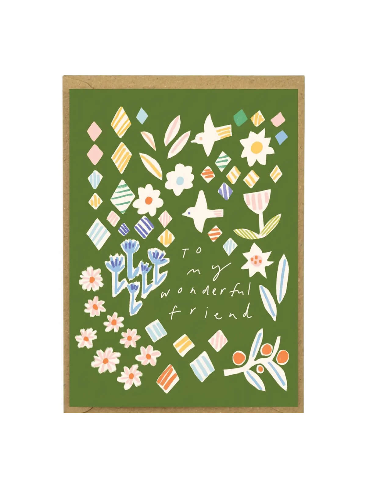A cheerful card featuring a collage of hand-drawn flowers, leaves, birds, and colourful geometric shapes on a green background. With the text 'To my wonderful friend', it’s a perfect way to celebrate someone special on any occasion.