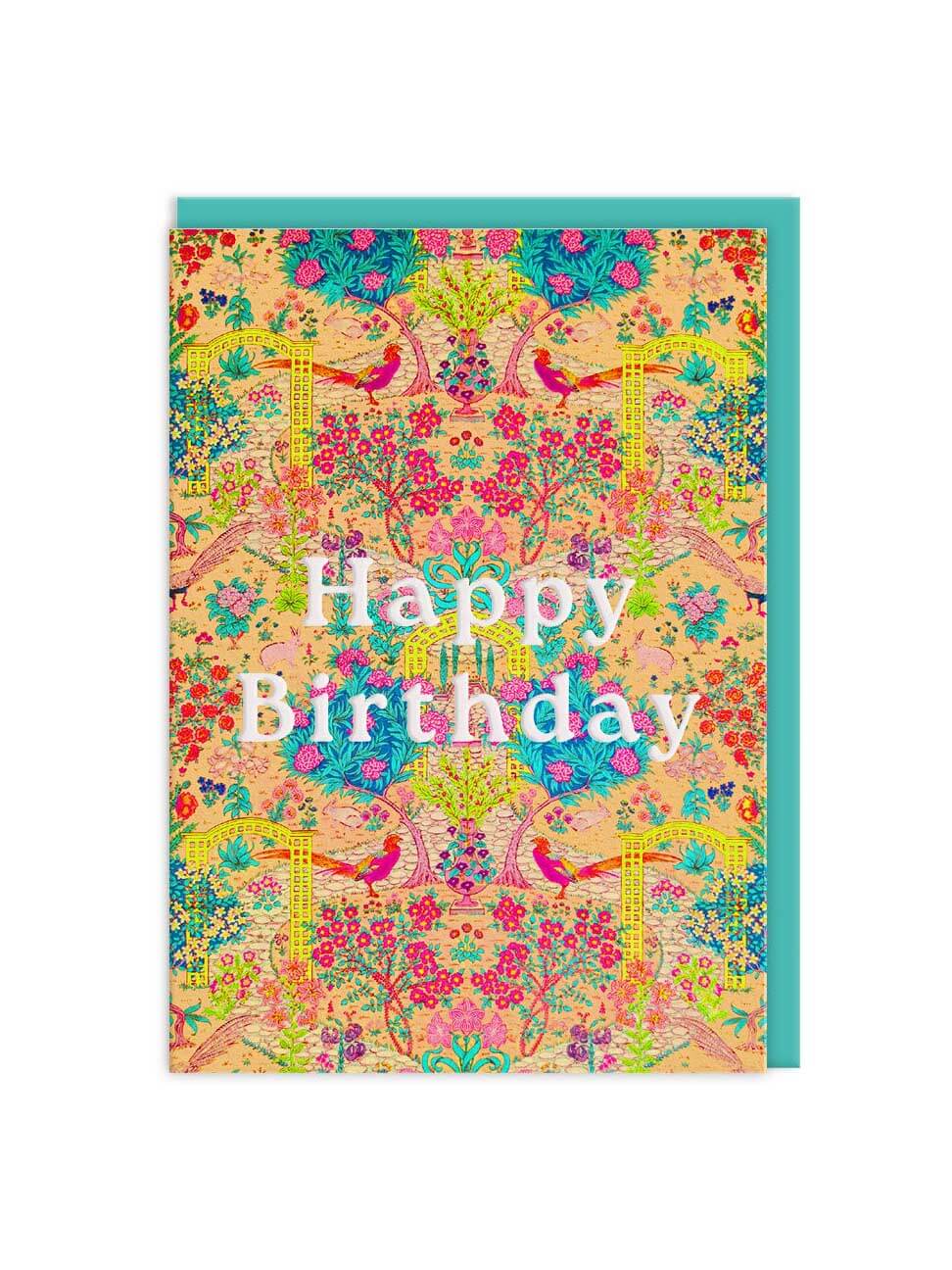 A bright birthday card inspired by a traditional floral garden design from the V&A Museum's collection. The card has 'Happy birthday' in white foil text.