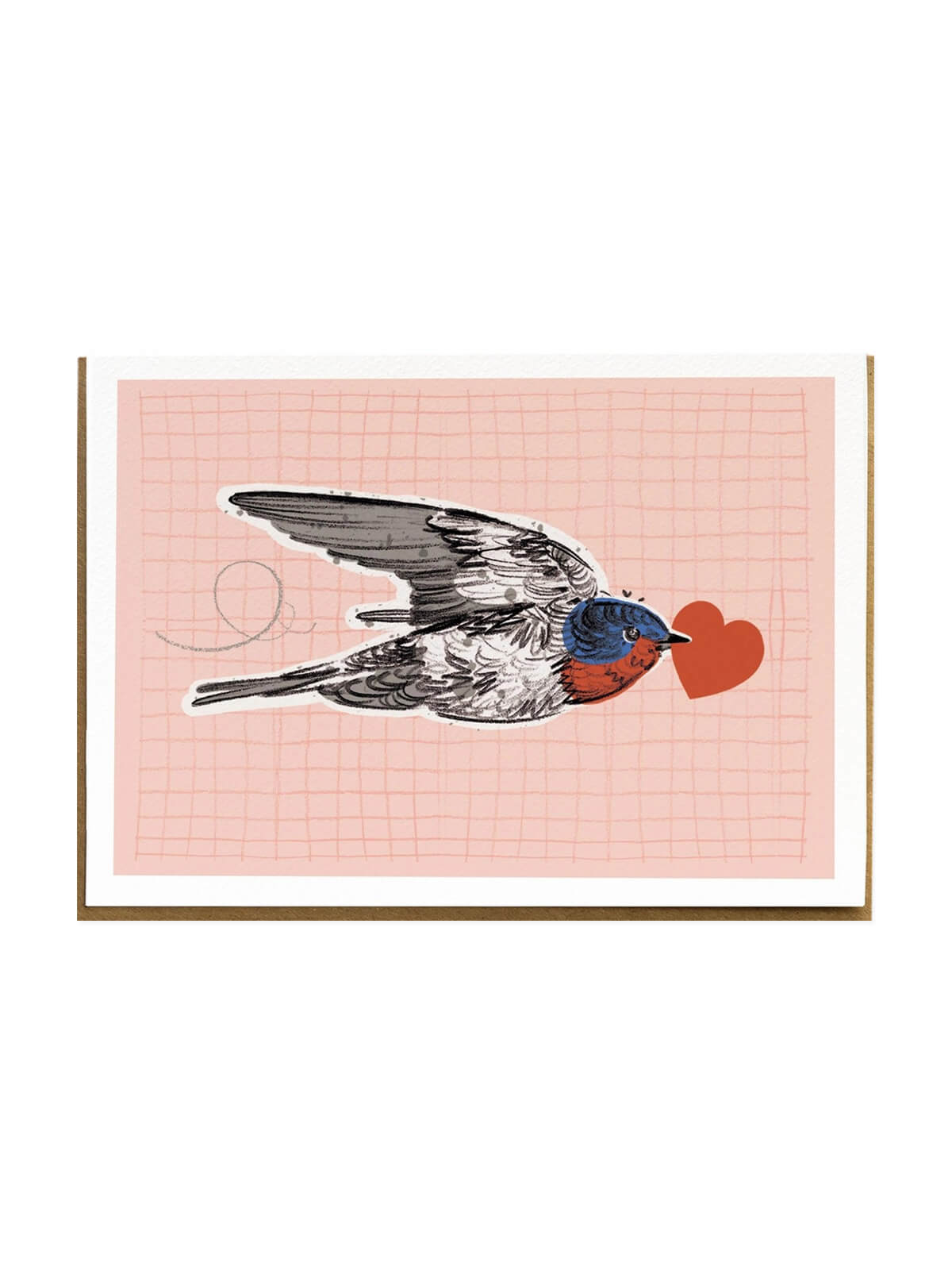A lovebird flying along with a red heart to share, a sweet card for Valentines' Day.