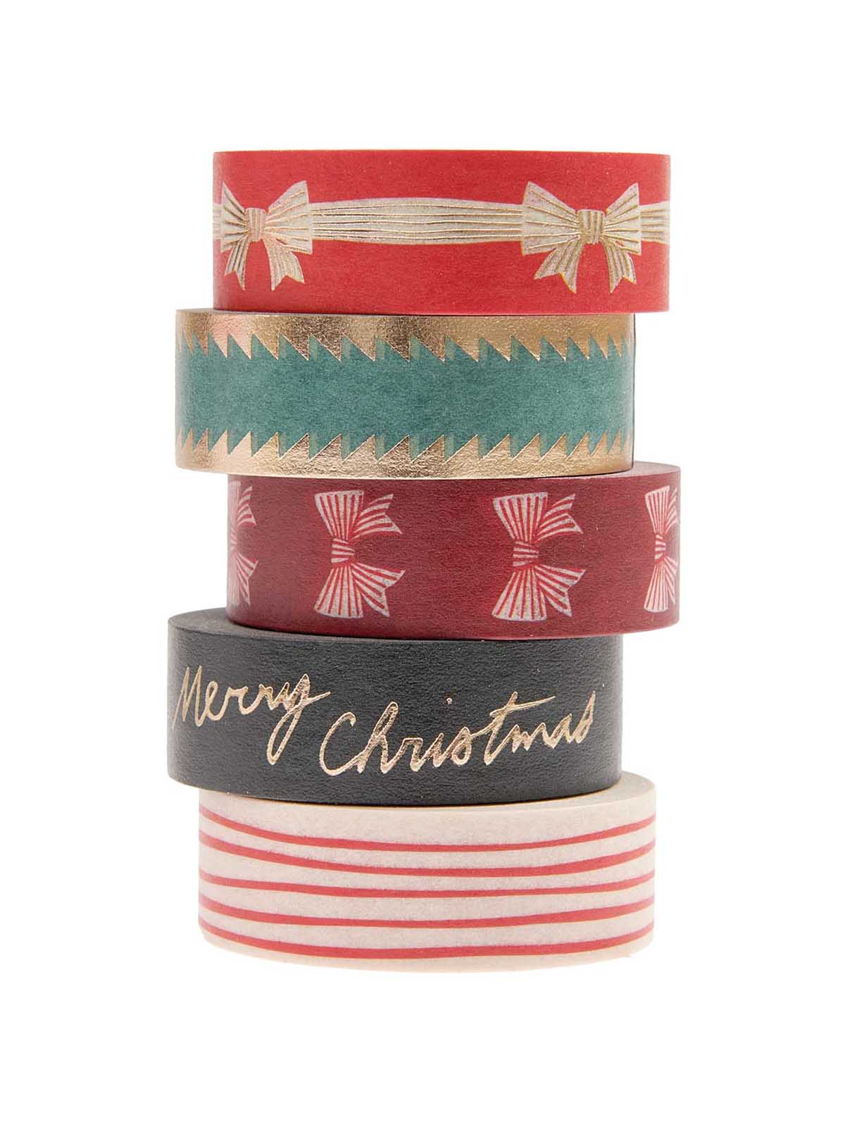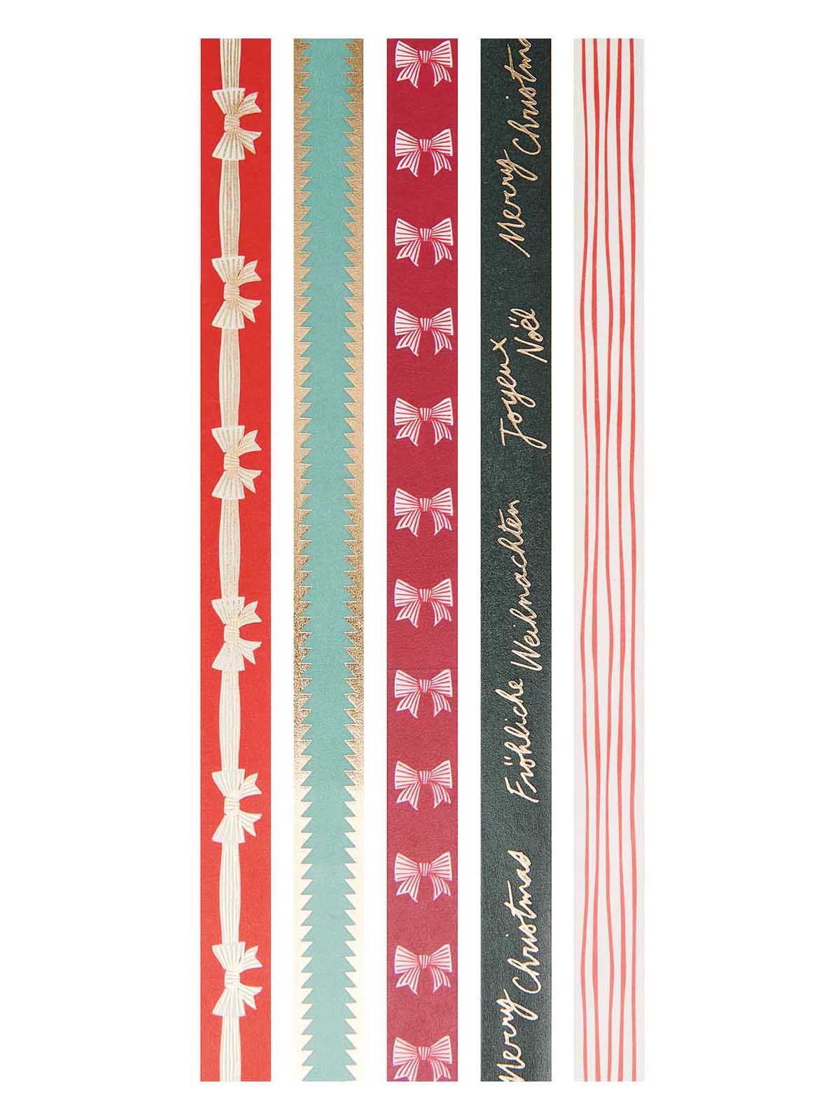 Set of 5 festive washi tapes from Paper Poetry with pretty bows and Merry Christmas text, in red, teal and brown with gold foil detail. The perfect addition for stylish Christmas wrapping.